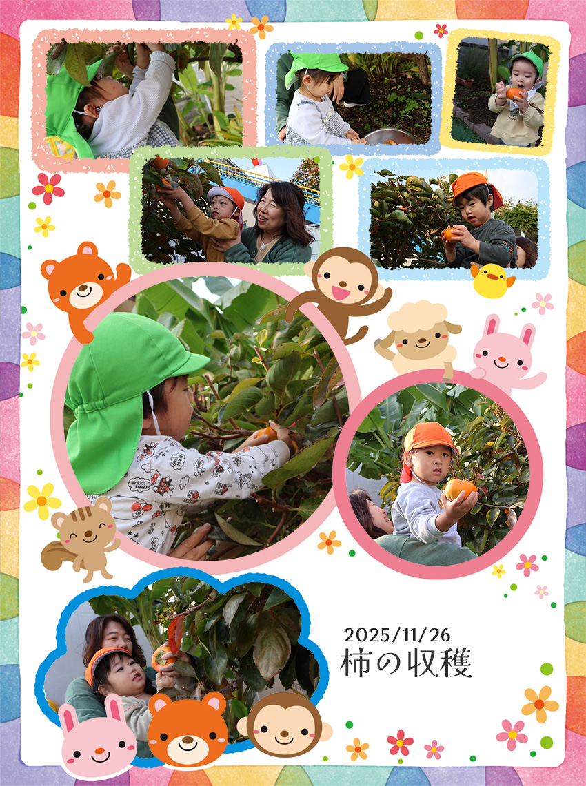 広場の柿の実がきれいに色づいてきたので、ひまわり組とたんぽぽ組さんで収穫をしました。