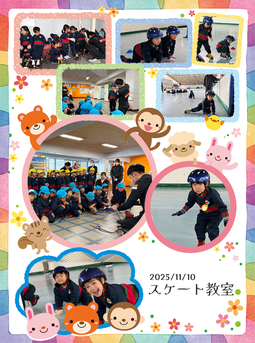 スケート教室では、体操の先生の話をしっかり聞いて、約束を守って参加することができました。こける練習や立ったり滑ったり刷る練習をしました。難しくても何度も挑戦し、最後には「立てたよー!」「見て!ここまで滑れた!」と喜びの声や笑顔が見られました。