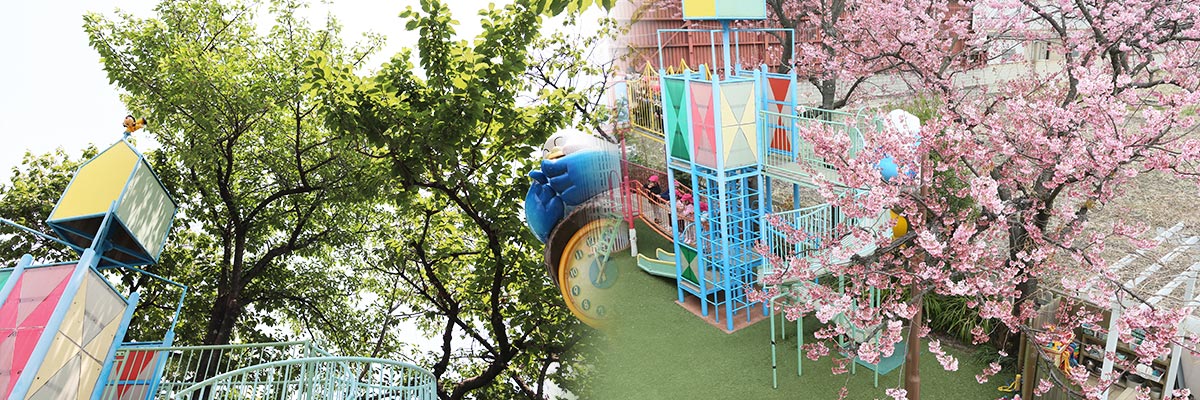 園庭にも多様な植物を配置しています。春は大きな椿寒桜の下でお花見ランチ会、初夏には砂場の上の藤棚から甘い香りが漂い、夏はセミの大合唱が響き、秋冬は落ち葉でままごと等々、それぞれの季節を肌で感じながら楽しんでいます。日々の遊びの中で動植物に触れることで子どもの興味や関心を広げ、五感も使って感覚を磨き思考力や想像力を豊かに育みます。