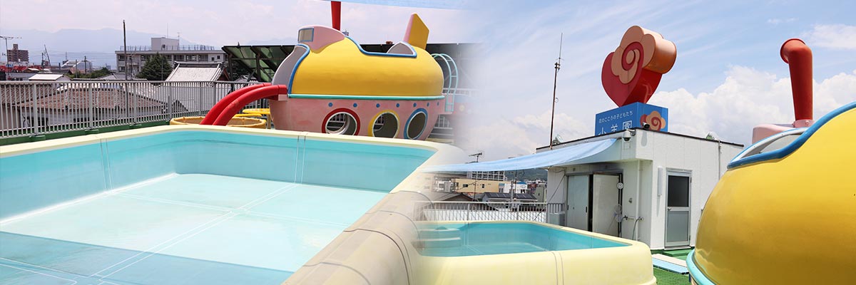 夏場の本館屋上には、縦5.5m横3.5mの幼児用プール、小さいサイズのプール2つ、テーブルセット、幼児用プールの上にはUVカットのネットも設置されます。こちらでは3~5歳児が夏の期間中はほぼ毎日利用しています。(2歳児の水遊びは本館前の園庭で行います。)